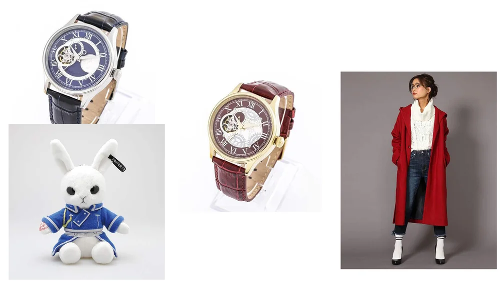 Super Groupies is a company in Japan that sells memorabilia based on anime and games. Their latest addition is a collection for Fullmetal Alchemist. The collection includes some cool watches, an Edward Elric coat, a Roy Mustang coat, a Roy Mustang stuffed bunny, and more.